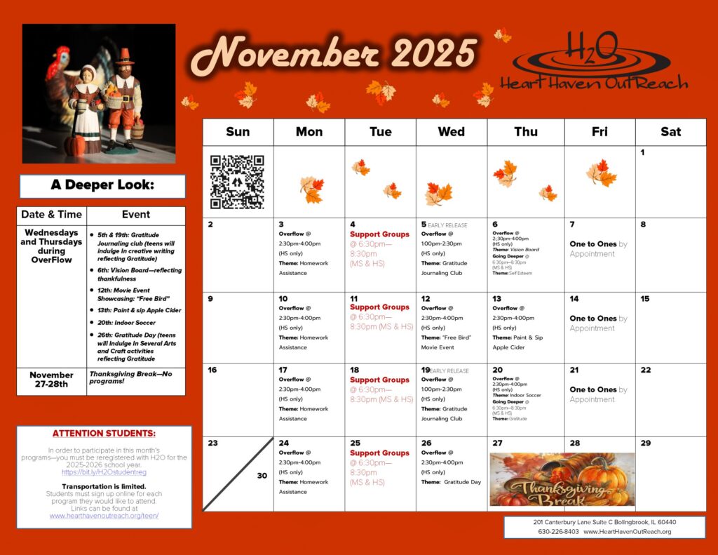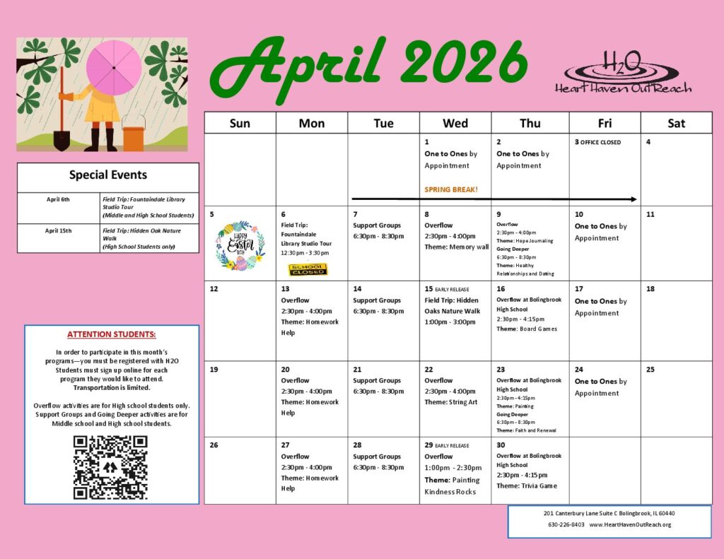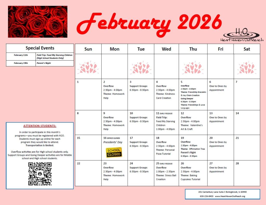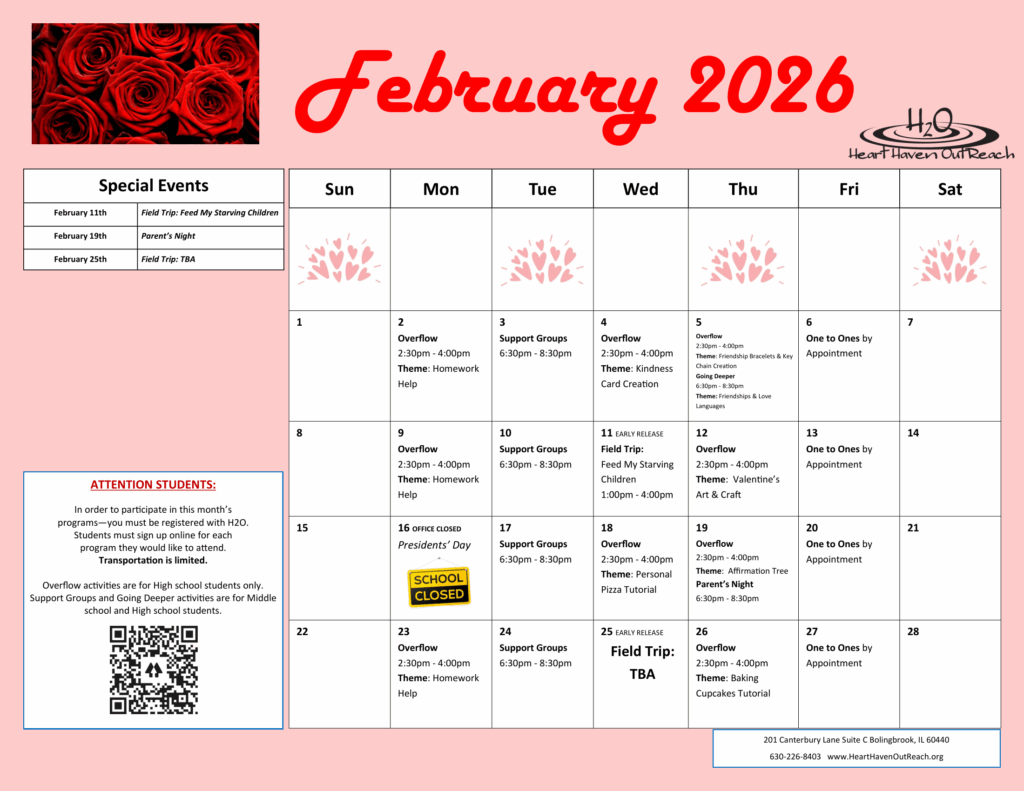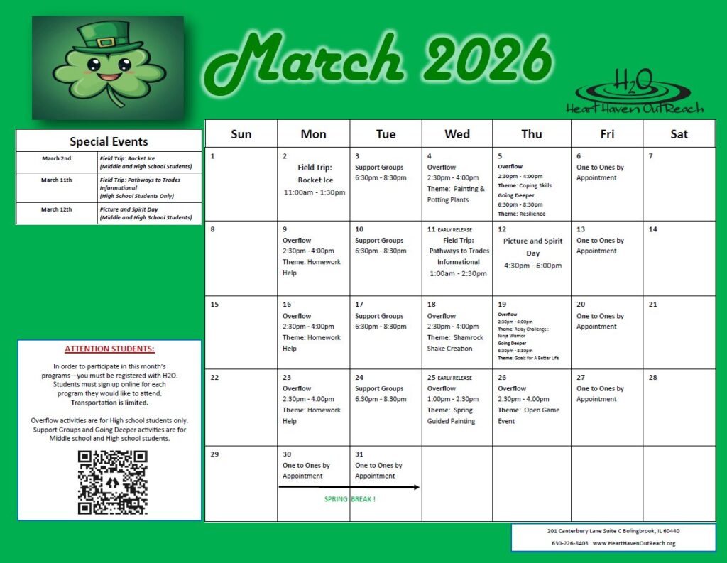 Registration is Free! All students must have the “New Student” registration completed before attending a program. Please scroll to the top of this page to find the link. If you would like to set up a meeting with one of our staff to talk about how you can be involved with H2O please call 630-226-8403 and let us know you want to register!